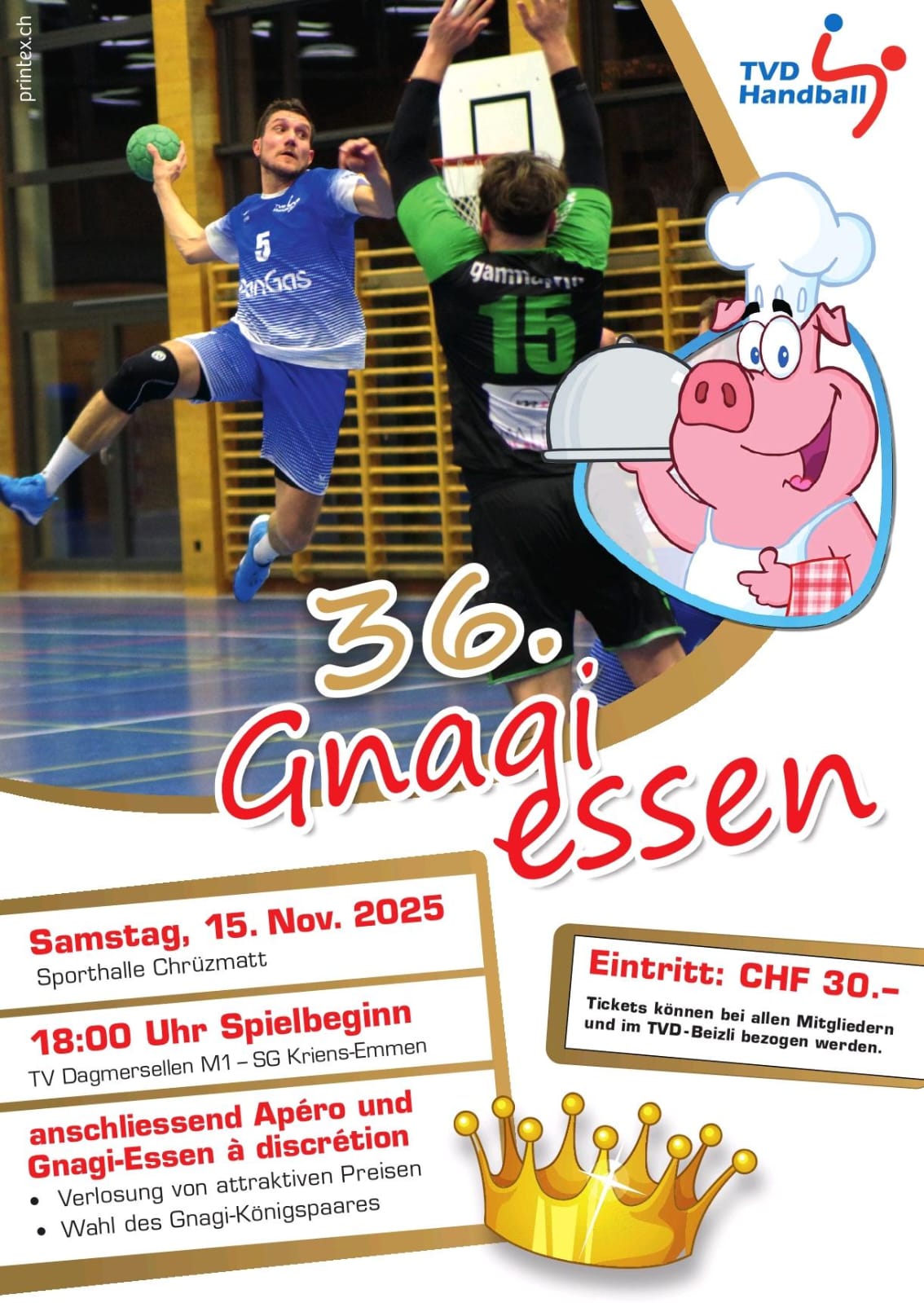 Am Samstag, 15. November findet erneut das bekannte Gnagi-Essen in der 36. Ausgabe in der Chrüzmatthalle in Dagmersellen statt. Der TVD Handball empfängt alle Handball-Interessierten und „Gnagi“ Liebhaber. Natürlich gibt es auch andere Speisen.